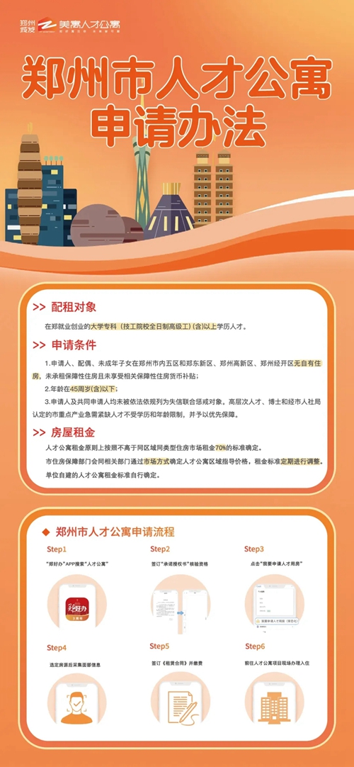本批次配租全流程通過線上進行,按照“一網通辦、一網通管”的原則,申請人可登錄“鄭好辦”APP(“一件事專區”→“住房保障一件事”),進入人才公寓配租模塊,按照提示進行申請、選房、簽約和退出。
