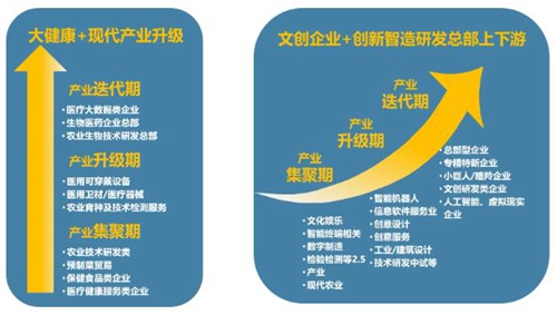 產業(yè)方面:以“大健康”+“文創(chuàng)娛樂”+“創(chuàng)新智造”為主導產業(yè),科技服務和創(chuàng)意研發(fā)為輔助產業(yè)。