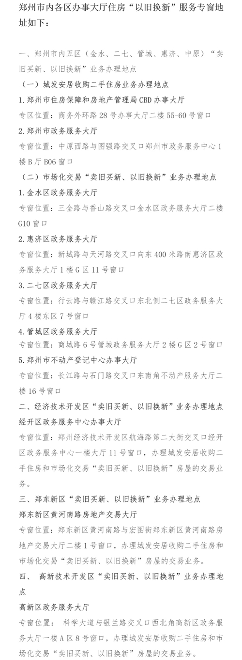 7月16日,記者從鄭州市房管局獲悉,為促進(jìn)該市房地產(chǎn)市場(chǎng)“賣舊買新、以舊換新”政策進(jìn)一步落實(shí),鄭州市房管局會(huì)同稅務(wù)、不動(dòng)產(chǎn)登記等部門,認(rèn)真梳理工作流程、全面開設(shè)服務(wù)專區(qū),全力推進(jìn)住房“以舊換新”工作。目前,鄭州市內(nèi)8區(qū)10個(gè)辦事大廳均開設(shè)“以舊換新”服務(wù)專窗,辦理相關(guān)業(yè)務(wù)可享受“專人專窗”的服務(wù)。