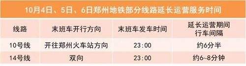 10月4日至6日,鄭州地鐵相關(guān)線路延長(zhǎng)運(yùn)營(yíng)服務(wù)時(shí)間,請(qǐng)您留意“鄭州地鐵”微信公眾號(hào)。