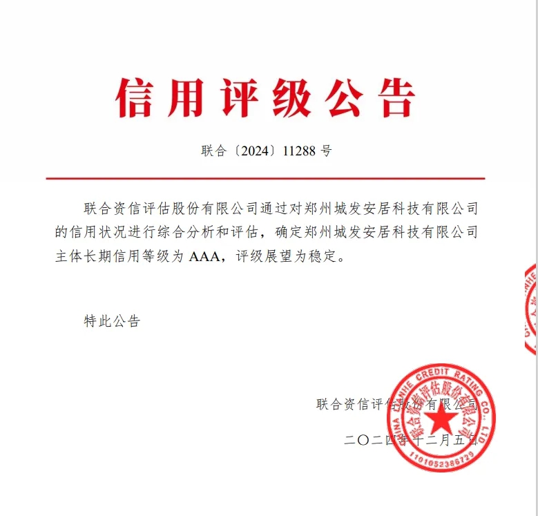12月5日,鄭州城市發(fā)展集團(tuán)有限公司下屬子公司鄭州城發(fā)安居科技有限公司(以下簡稱安居科技)順利取得AAA主體信用評級,評級展望為“穩(wěn)定”,成功邁入國內(nèi)企業(yè)信用等級第一梯隊(duì)。