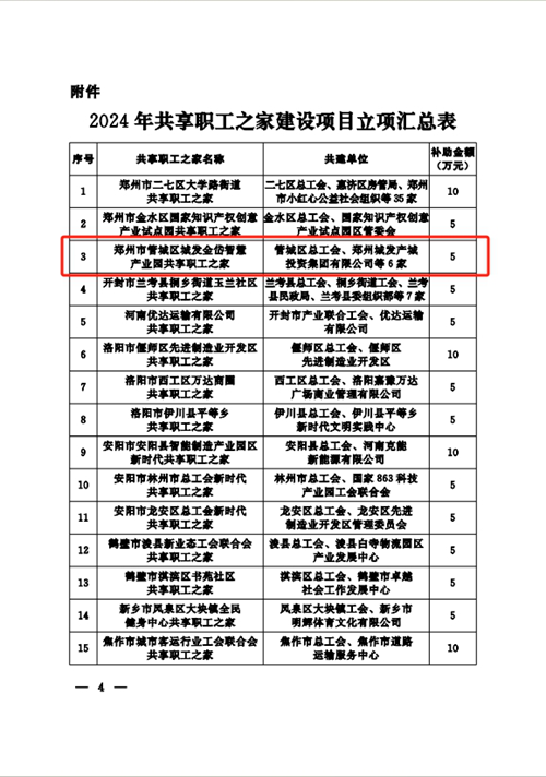 近日,河南省總工會(huì)發(fā)布《關(guān)于2024年共享職工之家建設(shè)項(xiàng)目立項(xiàng)的通知》,決定對城發(fā)金岱智慧產(chǎn)業(yè)園共享職工之家等32個(gè)共享職工之家建設(shè)項(xiàng)目進(jìn)行立項(xiàng),并對城發(fā)金岱智慧產(chǎn)業(yè)園共享職工之家給予資金補(bǔ)助,鄭州市僅有三家職工之家獲得立項(xiàng),這是城發(fā)金岱智慧產(chǎn)業(yè)園共享職工之家建設(shè)運(yùn)營后取得的第一份殊榮。