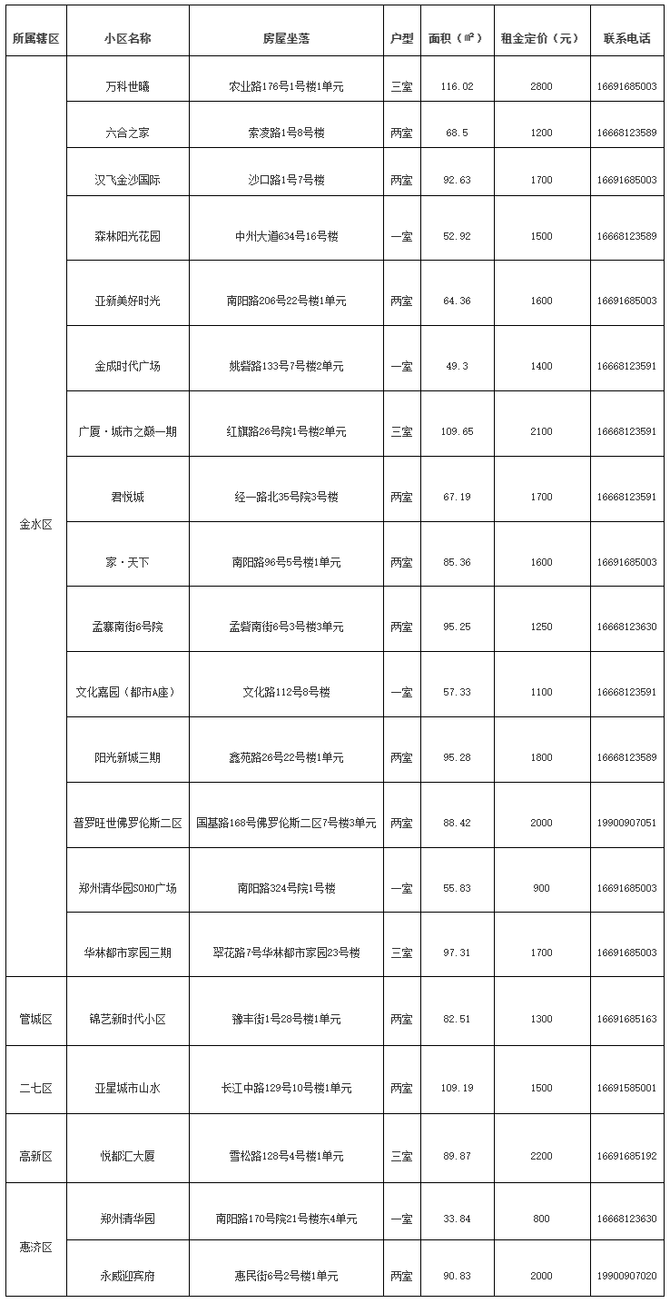 金水區15套配租房源所在小區包括萬科世曦、六合之家、漢飛金沙國際、森林陽光花園、亞新美好時光、金成時代廣場、廣廈·城市之巔一期、君悅城、家·天下、孟寨南街6號院、文化嘉園(都市A座)、陽光新城三期、普羅旺世佛羅倫斯二區、鄭州清華園SOHO廣場、華林都市家園三期。