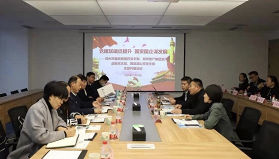 為深入學習貫徹黨的十九屆五中全會精神,進一步促進國資國企改革發展,不斷探索黨建與企業科學發展的有機融合,11月19日下午,鄭州市國資委第四黨支部與鄭州地產集團資產戰略黨支部、西流湖公司黨支部聯合開展支部共建活動。鄭州市國資委黨委委員、副主任劉學銀,副調研員范桂田,第四黨支部書記、財務監管處處長范競,產權管理處處長常艷麗,鄭州地產集團資產戰略黨支部書記、資產運營部部長王樂琪,西流湖公司黨支部書記、董事長、總經理吉獻亮,副總經理李金光參加活動。