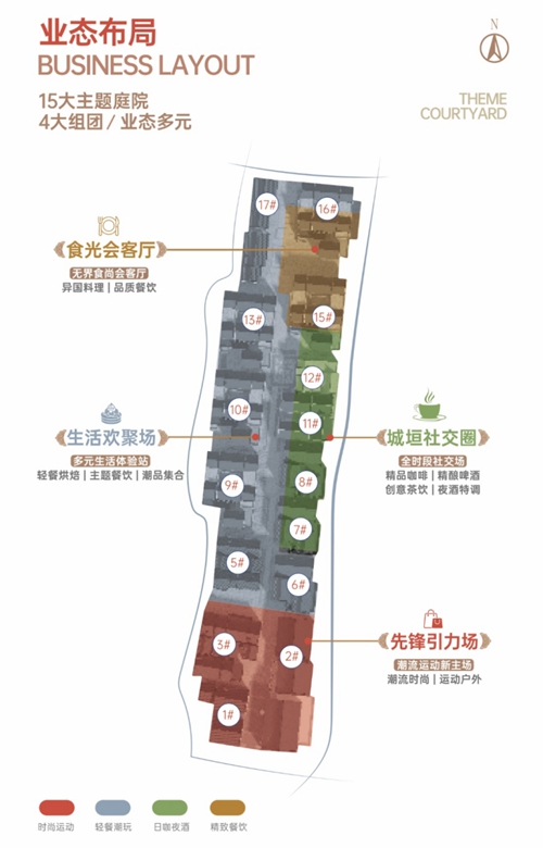 (十五個(gè)院落、四大組團(tuán)業(yè)態(tài)分布示意圖)