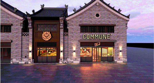以COMMUNE幻師的門店設(shè)計(jì)為例——從效果圖可以看出,建筑外部以青灰色磚墻復(fù)刻商代建筑肌理,檐角神獸造型融入現(xiàn)代燈光設(shè)計(jì),整體風(fēng)格充滿著古樸與時(shí)尚。店內(nèi)則以暖色調(diào)營造松弛感,酒墻擺滿了來自全球的精釀。每當(dāng)味蕾觸碰到精釀的麥香,窗外同時(shí)飄入來自3600年前夯土的氣息——在這里,顧客喝的不是單純的酒,而是歷史與現(xiàn)代的奇妙敘事。