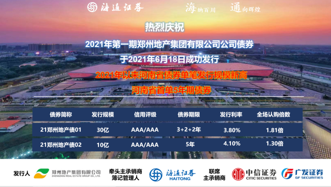 黨史學習教育在鄭州地產集團如火如荼開展,集團黨委在鄭州市委、市政府的領導下,在鄭州市國資委黨委的監管下,在學黨史、悟初心的基礎上,將“辦實事、解難題”作為黨史學習教育的重要內容,充分釋放黨建紅色生產力,推進黨史教育深入業務實踐,引領業務高質量發展。在集團黨委的堅強領導下,鄭州地產集團6月18日成功發行第一期優質企業債券40億元,3+2+2年期產品發行利率3.8%,5年期產品發行利率4.1%。本次發行創河南省首單5年期企業債券,創2021年以來河南省債券單筆發行規模新高,是鄭州地產集團資本市場融資工具的又一創新探索!
