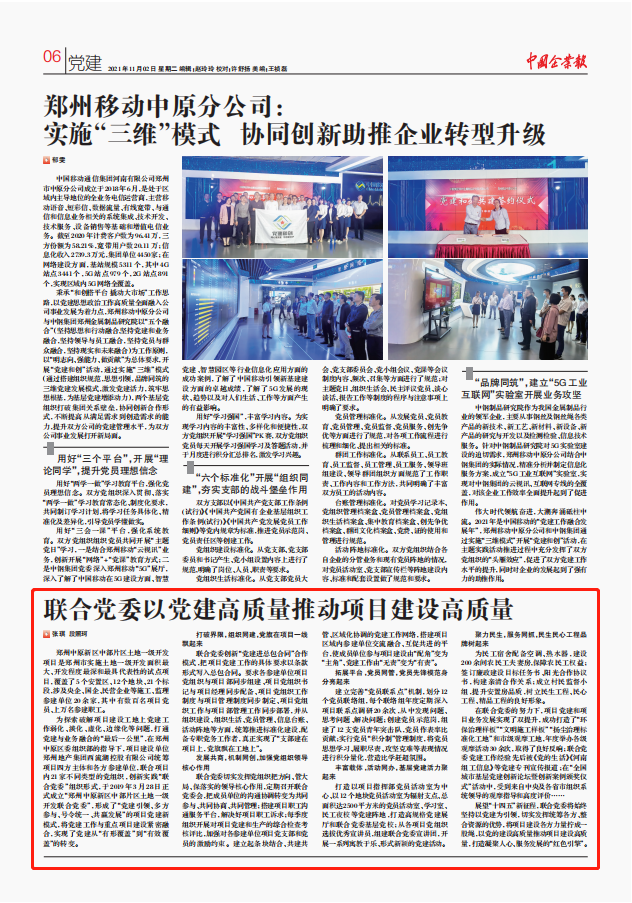 西流湖公司始終堅(jiān)持“抓好黨建就是最大的政績”,創(chuàng)新“黨建進(jìn)總包合同”合作模式,貫徹落實(shí)“支部建在項(xiàng)目上,黨旗飄在工地上”的工作思路,以中原新區(qū)中部片區(qū)土地一級開發(fā)聯(lián)合黨委和項(xiàng)目黨支部建設(shè)為抓手,以“12343”黨建工作體系為指引,讓黨的主張、黨的作風(fēng)、黨組織的力量在項(xiàng)目建設(shè)中處處彰顯,充分激發(fā)黨員的先鋒模范作用和黨組織的堅(jiān)強(qiáng)堡壘作用,將黨建轉(zhuǎn)化為生產(chǎn)力,真正實(shí)現(xiàn)黨建促發(fā)展的“紅色引擎”作用。公司黨建工作先進(jìn)經(jīng)驗(yàn)榮登《中國企業(yè)報(bào)》,意味著公司黨建工作先進(jìn)經(jīng)驗(yàn)對于全國企業(yè)黨建具有良好的借鑒意義,標(biāo)志著公司黨建工作及宣傳水平再上新臺階。